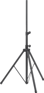 Dreieckiger Fuß aus 35mm-Vierkantrohr, Stellfläche 450 x 390 mm. Ständerrohr Ø 40 / 35 mm, höhenverstellbar von 91,5 - 150 cm, mit Knebelschraube feststellbar. Bei schweren Lautsprechern kann der Ständer mit dem mitgelieferten Sicherungsstift in den Stufen 102 - 114 - 126 - 138 - 150 arretiert werden.