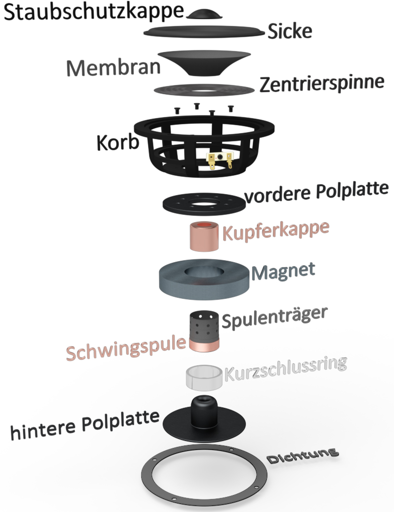 Für die genauere Erläuterung, habe ich eine Explosionsgrafik von einem Wavecor Chassis erstellt. Es ist der WF152BD04, der heute herhalten darf für unsere Theorie.