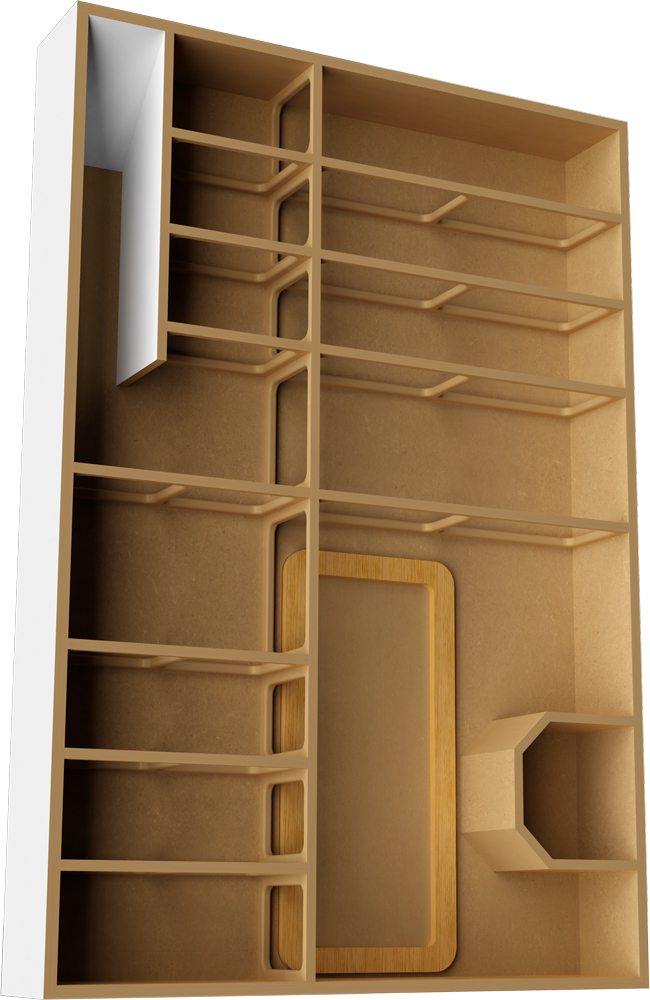 Die Front sollte so viel Überstand auf der Innenseite haben, dass die Front im gewinkelten Zustand bündig an der Wand anliegt. Bei Massimo im Studio haben wir 250 mm Überstand auf der Innenseite gewählt.