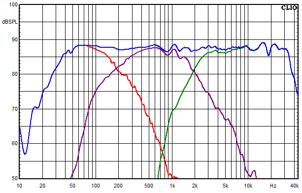 - einem Bandpass aus Hochpass 2. Ordnung (12 dB / Oktave) und Tiefpass 2. Ordnung (12 dB / Oktave) für den Mitteltöner