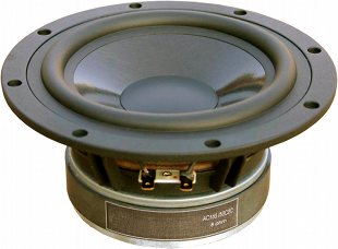 16 cm Tieftöner mit Papier-Membran. Zur Vermeidung von Kompressionseffekten hat er eine Polkernbohrung. Der Korb des Lautsprechers ist per Druckgussverfahren hergestellt.