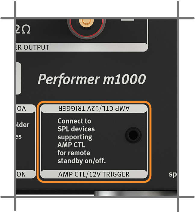 Die Endstufe kann mit Hilfe der AMP CTL-Verbindung zwischen einer Vorstufe wie dem Director Mk2 oder dem Crossover mit ein- und ausgeschaltet werden. Hierzu verbinden Sie die 3,5 mm-Klinkenbuchsen mit einem Kabel mit 3,5 mm Mono- oder Stereoklinkensteckern. Auch Vorverstärker von Fremdfabrikaten können den Performer m1000 mit seinem 12 V-Trigger ein- und ausschalten.