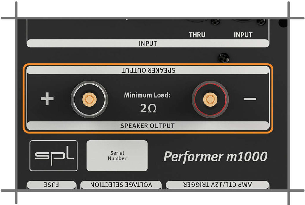 Die Lautsprecher-Polklemmen können sowohl Bananenstecker als auch eine Litze mit bis zu 4mm Durchmesser aufnehmen. Für den Bi-Wiring-Betrieb können beide Anschlussarten gemeinsam genutzt werden. Es darf kein Lautsprecher mit weniger als 2 Ohm Impedanz angeschlossen werden.