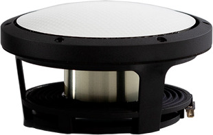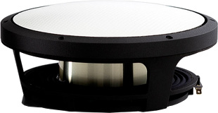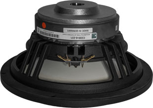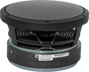 27 cm Tieftöner mit Sandwich-Membran. Ein Magnetsystem mit Neodym-Magneten treibt den Lautsprecher an. Er hat eine hinterlüftete Schwingspule. Die Unterhangschwingspule bleibt im linearen Betrieb komplett im Magnetfeld.