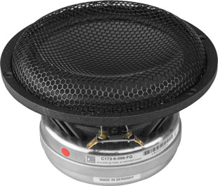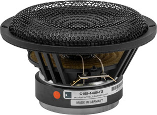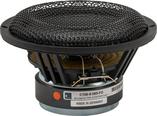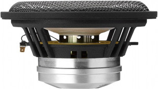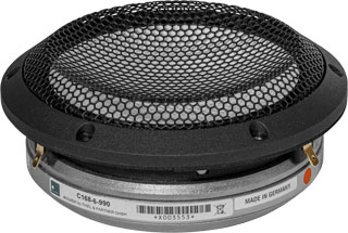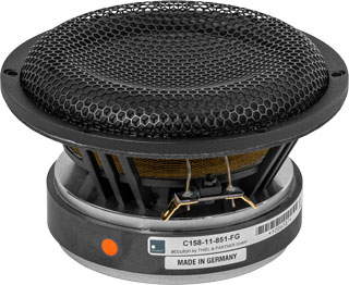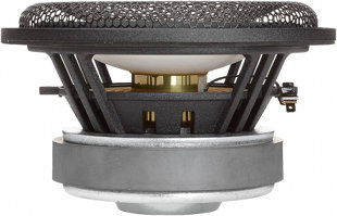 16 cm Tiefmitteltöner mit Keramik-Membran. Ein Magnetsystem mit Neodym-Magneten treibt den Lautsprecher an. Die Unterhangschwingspule bleibt im linearen Betrieb komplett im Magnetfeld. Er hat eine hinterlüftete Schwingspule.