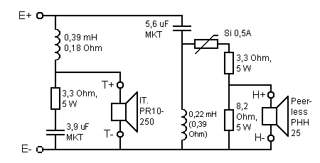 Die hier beschriebene Frequenzweiche ist besonders einfach und stammt aus unserem Bausatz PA 250 mit dem eine schweizer Jugendgruppe draußen und drinnen beschallt. Die Box leistet in 1 m Entfernung und bei 250 Watt Eingangsleistung 120 dB Schalldruck, was als Schmerzgrenze bezeichnet wird - Es handelt sich um eine auf Lautstärke getrimmte Box, die kurzfristige Impule von bis zu 1000 Watt verarbeitet.