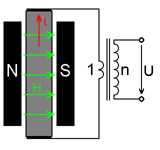 Wird das Bändchen nun durch den Strom i durchflossen (roter Pfeil), dann bildet sich durch das Magnetfeld (grüne Pfeile, horizontal gerichtet) eine Kraft, die senkrecht zum Strom und senkrecht zum Magnetfeld läuft - also senkrecht zur Bildebene. Die Membran (grau) wird senkrecht zur Bildebene, also auf uns zu oder von uns weg (je nach Stromrichtung) bewegt.