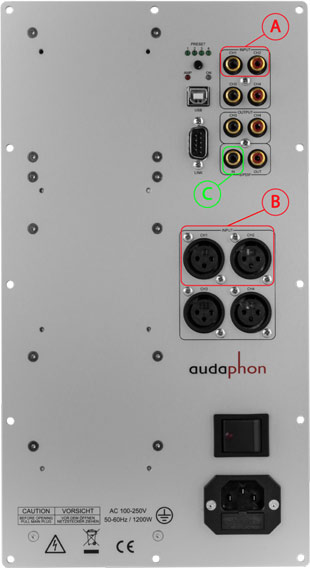 In High-End-Anwendungen, bei denen Verstärker und Lautsprecher eine Einheit bilden, kann auch pro Lautsprecher ein audaphon AMP-2500 verwendet werden. Dazu können die eingebauten Verstärker gebrückt werden. Beim Anschluss im Brückenbetrieb sind ein paar Details zu beachten, die in der Bedienungsanleitung detailliert beschrieben sind.