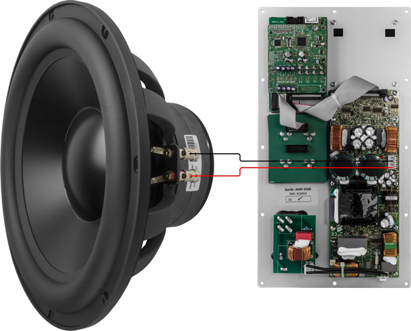 Wir haben beim DON ein 8 Ohm Chassis verwendet und somit ist der Brückenbetrieb möglich. In der linken Abbildung ist ein Wavecor Subwoofer an den audaphon AMP-2500 angeschlossen. Der "+" Anschluss von Kanal 1 und der "+" Anschluss von Kanal 2 werden verwendet. Für den Brückenbetrieb muss auf der Rückseite vom AMP-2500 eine Kurzschlussbrücke (Jumper) auf zwei Kontakte (Pins) mit der Beschriftung "CH1/2-Bridge Operation" gesteckt werden.
