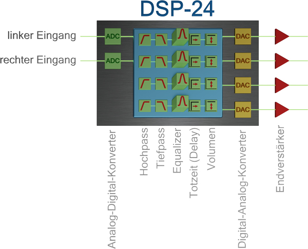 Das linke Bild zeigt den schematischen Aufbau vom audaphon DSP-24. Im Eingangsbereich wandeln die Analog-Digital-Konverter (grün) das analoge Signal in ein digitales Signal um. Der Digital-Signal-Prozessor (blau) verarbeitet die Daten nach der eingestellten Konfiguration. Diese Konfigurationen können aus Pegelanpassungen, Frequenzübergängen und parametrischen Equalizer-Einstellungen bestehen und beliebig kombiniert werden. Der DSP-Chip ist auch für die Lautstärkeregelung zuständig. Der Digital-Analog-Konverter (gelb) wandelt die bearbeiteten digitalen Signale aus dem DSP in analoge Signale um. Diese analogen Signale werden anschließend an die Verstärker (rot) weitergeleitet.