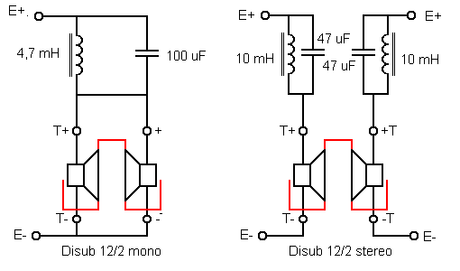 links die Monoweiche, wenn beide Tieftöner an einem Verstärkerkanal angeschlossen werden