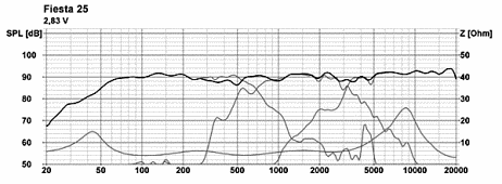 Die nicht unkritische Kombination dieser ungewöhnlichen Chassis verlangt eine sorgfältige Frequenzweichenentwicklung, um das hochgesteckte Ziel einer Box, die auch HiFi-Maßstäben gerecht wird, zu erreichen. Auch wenn der Frequenzgang nicht so schnurgerade verläuft, wie das mit anderen Lautsprechern möglich ist, so wird man doch mit einem bemerkenswert guten Klang belohnt. Die Fiesta 25 klingt angenehm - von tiefen kräftigen Bässen, über klare offene Mitten bis zu den obersten filigranen Höhen. Im Unterschied zu gängigen HiFi-Boxen kann sie aber auch bei Bedarf mit extremen Pegelspitzen und mit bedrohlichen Dauerpegeln mühelos den Wohnraum erschüttern. Eine gut kontrollierte Richtcharakteristik der relativ stark bündelnden Hörner sorgt bei sorgfältig aufgenommenen Tonkonserven für eine präzise Ortbarkeit und Tiefenstaffelung der Tonquellen, wenn der Zuhörer eine günstige Sitzposition in der Mitte zwischen den Boxen eingenommen hat.