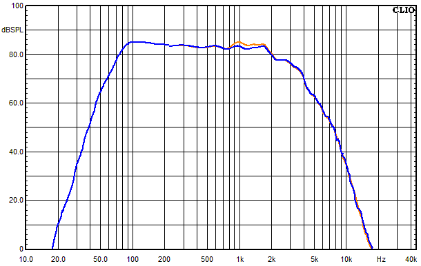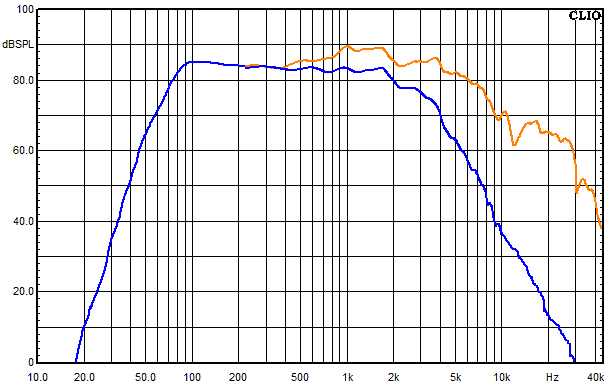 - Blau = Summe aus Hochtöner, Mitteltöner und Tieftöner auf Achse gemessen