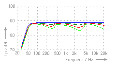 Da die Abnahme des Pegels mit zunehmendem Winkel aber vom Durchmesser des Lautsprechers abhängt, ergibt sich frequenzabhängig ein Pegel-Muster wie im Bild links verdeutlicht. Übernimmt mit steigender Frequenz ein kleinerer Lautsprecher, so wird ab dieser Frequenz der Pegelabfall wieder geringer sein.