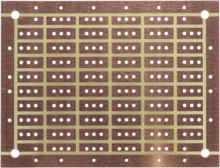 Si no desea emplear el laminado de cobre, recomendamos las placas con laminado de fibra de vidrio Epoxy, en uno de cuyos lados se colocan los componentes, que se unen entre sí en el lado opuesto. Estas placas están disponibles en diversos tamaños, todas con un paso entre orificios de 5 mm.