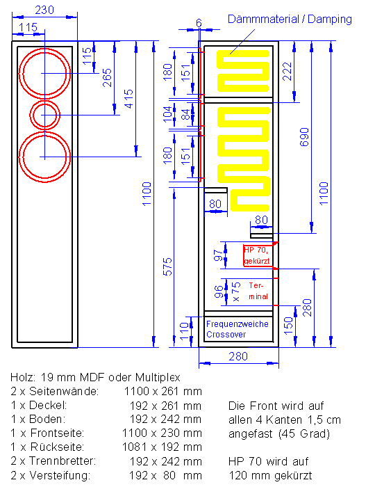 In die Box sind oben 1/2 Beutel Dämmwatte (1 Matte) einfach gefaltet lose in das Volumen einzubringen. Der Rest ist oberhalb der unteren Verstrebung im Volumen einzubringen, so dass das Bassreflexrohr frei bleibt.