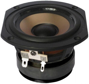 10 cm Tieftöner mit Polypropylen-Membran. Ein Magnetsystem mit Neodym-Magneten treibt den Lautsprecher an.