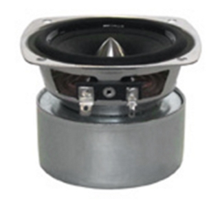 10 cm Breitbandlautsprecher mit Papier-Membran. Der Lautsprecher ist geschirmt. Ein Magnetsystem mit Neodym-Magneten treibt den Lautsprecher an. Die Unterhangschwingspule bleibt im linearen Betrieb komplett im Magnetfeld.