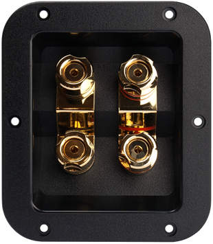 This terminal plate with four binding posts is suitable for bi-wiring (tweeter and woofer are connected to the amplifier separately). The plate is made of sturdy ABS. It's available with binding posts either with metal screw (pictured) or plastic covered crew. Suitable for mounting are 3.9 mm tallow-drop screws.