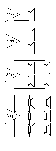 The picture on the right shows some of our stacking suggestions. Considering a matrix of 2 subwoofers each in parallel, the partnered subwoofer has to carry a load of three to four times the planned power, when the partnered subwoofer blows; therefore, the voice coils are in series. As the diagram on right shows, the partnered subwoofer in series is protected against damage of the voice coil.