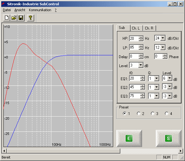 Bild 2: Aufnahme des PC-Programms, das mit den Sitronik-Modulen mitgeliefert wird. Damit kann der Frequenzgang angepasst und dann auf das Verstärkermodul geladen werden. (rote Line: Frequenzgang des Subwoofers, blaue Linie die der Satelliten - hier deckungsgleich)