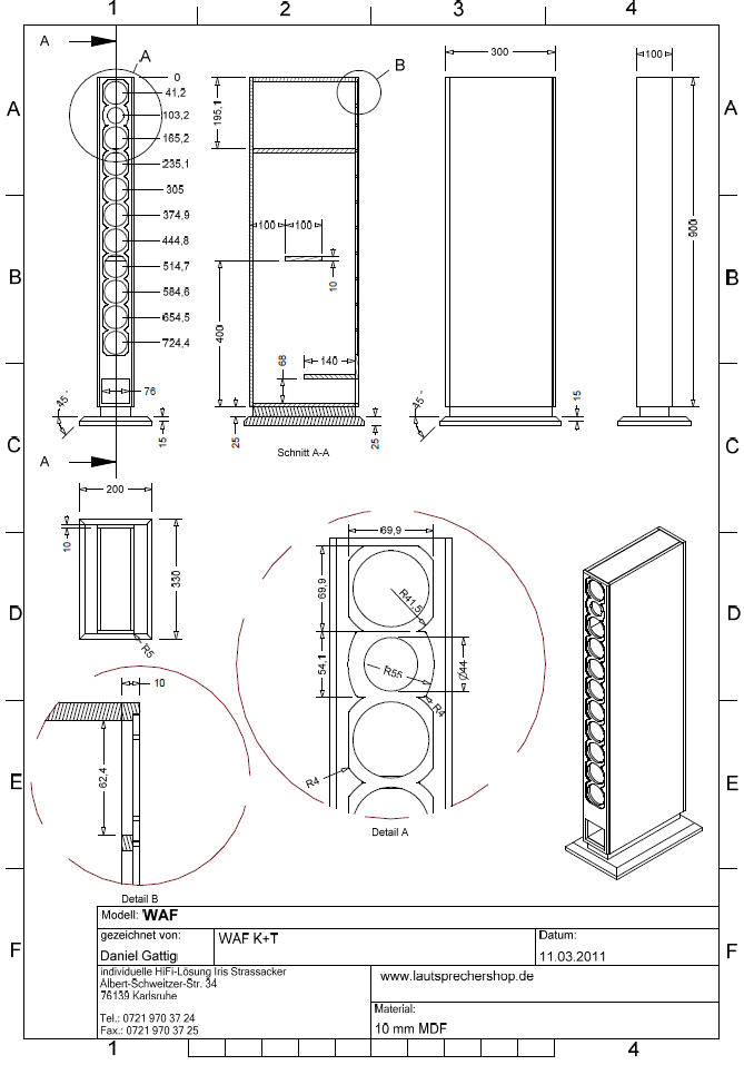 WAF ist ein zierlicher Standlautsprecher, unauffällig schmal und dennoch in der Lage einen großen Raum zu beschallen. Auf der Selbstbaumesse in Stuttgart 2011 beschallte sie mit Leichtigkeit 100 m2. Durch die schmale Front wurde als Nebeneffekt erzielt, dass das Rundstrahlverhalten ganz außergewöhnlich gut ausfällt.