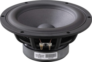 Der Tieftöner WF223BD02 von Wavecor hat eine leichte mit Glasfaser verstärkte Papiermembrane (unter 33 g). Das Chassis besitzt einen starken Antrieb und ist mit der Balanced-Drive-Technologie ausgestattet. Wavecor optimiert bei der Balanced-Drive-Serie die Symmetrie vom Magnetfeld und der Mechanik. Somit sinken die Verzerrungen und die mechanischen Verluste. Der Treiber hat eine lineare Auslenkung von +/- 6,5 mm und kann somit auch bei hohen Pegeln verzerrungsarm spielen. Die mechanischen Verluste sind unter 0,5 Rms und somit auf erfreulich niedrigem Referenzniveau.