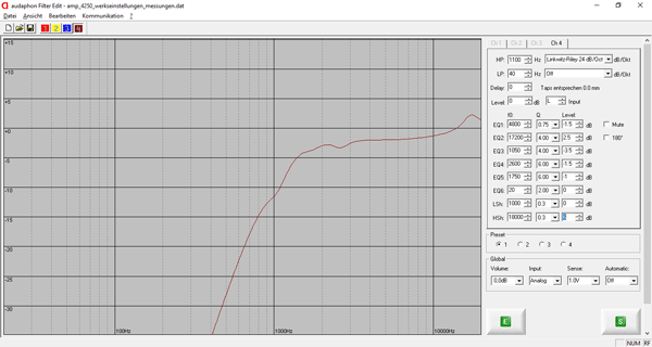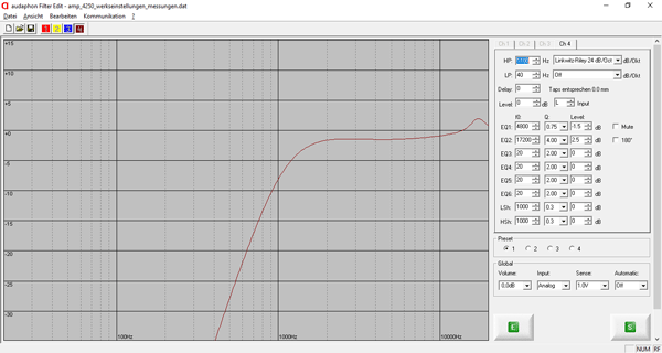 Mit einer Anhebung bei 17.200 Hz um +2,5 dB und einem Gütefaktor von 4 (schmalbandiger Wirkungsbereich) wird der Pegel auf das durchschnittliche 95 dB Niveau vom Hochtöner angehoben.