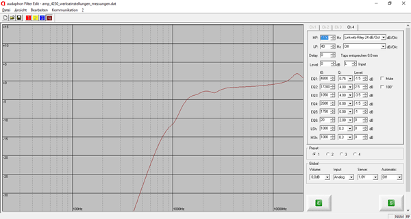 In der linken Abbildung ist die Bedienoberfläche der Software vom audaphon AMP-4250 zu sehen. Die Software erkennt automatisch das angeschlossene audaphon Gerät und passt die Filter und Oberflächen an die entsprechende Hardware an. Der Hochtöner wird in diesem Beispiel auf Kanal 4 (CH 4) angeschlossen. Der Hochpassfilter wird mit 1,1 kHz und 24 dB / Oktave eingestellt. Es wird eine Linkwitz-Riley Charakteristik verwendet. In der zweiten Messung (blau, siehe Abbildung oben) kann man das akustische Ergebnis nachprüfen.
