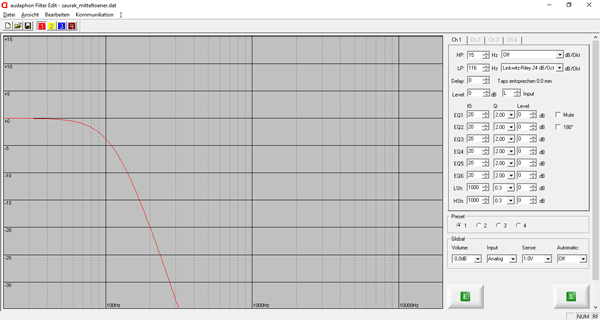 Der Tiefpassfilter (LP) wird bei 116 Hz mit einer Flankensteilheit von 24 dB / Oktave und einer Linkwitz-Riley Charakteristik eingestellt.