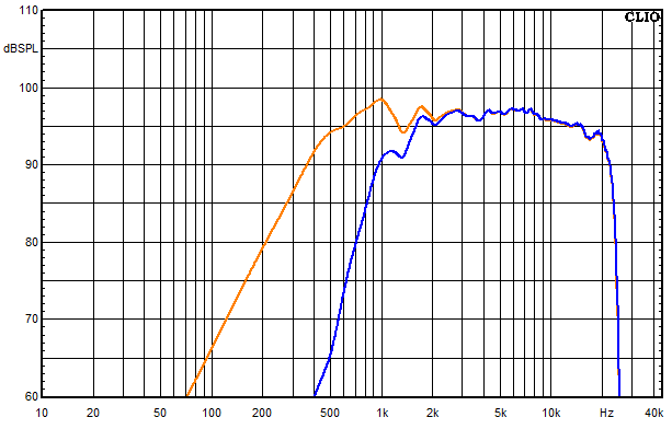 Die erste Messung (orange) zeigt den Hochtöner ohne Filter. Bei der Zaurak ist das Ziel, den Hochtöner mit einer Übernahmefrequenz von ungefähr 1 kHz in das System einzubinden. Die zweite Messung (blau) zeigt den Hochtöner mit dem Hochpassfilter. Der Hochtöner der Zaurak wird wegen der tiefen Trennfrequenz von 1 kHz mit einem steilflankigen Filter beschaltet. Somit ist der Hochtöner auch bei höheren Pegeln vor Überlastung geschützt.
