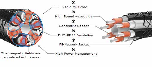 The little brother of the LS-1203 has an 8-fold multicore design. The tightlypacked PE-Network Jacket holds the wires together and reduces micro-vibrations (High Power Management), which occur in the cable from the changing magnetic fi elds in the beat of the music. The cable therefore also transmits high level and extreme dynamic peaks with absolute precision.