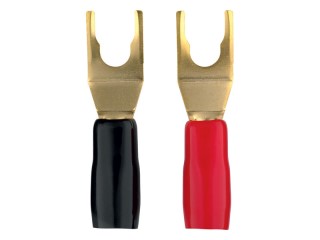 Spade lug for cross-section of up to 6.0 mm² made of 24c gold-plated OFC-copper for crimping or soldering. With 6/8 mm graded fork. black/white coding.