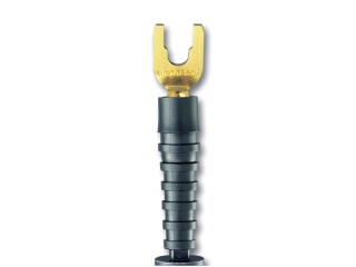 The cable receptacle and the plug are constructed in one piece so that contact resistance can be avoided. The surface coating of rhodium is extremely durable. A special feature is the slotted spade lug, achieved through the slot contact spring deforming when tightening the screw concave, and thus preventing the cable from slipping out of terminals. Suitable for in-akustik Reference speaker cables or all high end speaker cables with a diameter up to 10 mm².