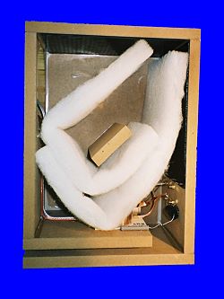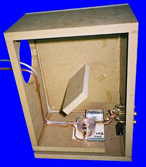 Falls man der Box hinten herum genügend Platz läßt, kann der Baßreflexkanal auch auf der Rückseite münden. Wichtig ist die Gesamtlänge von 23,2cm, um auf eine Abstimmfrequenz von 40Hz zu kommen. Der Kanalquerschnitt von 1,2 x 16,2 cm entspricht einem 5cm-Rohr (Innendurchmesser).