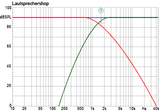 Die Trennfrequenz liegt im Diagramm bei 1500 Hz und wird durch den Schnittpunkt der Hoch- und Tieftonkurve markiert.