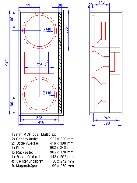 Wird die Box oft transportiert, so sollten 4 Magnetträger eingebaut werden: die eingezeichneten 2 Bretter, die an der Rückseite befestigt werden und von Versteifungsbrett links nach Versteifungsbrett rechts gehen. Darüber hinaus können noch 2 Bretter befestigt werden, die das seitliche Verschieben verhinden.
