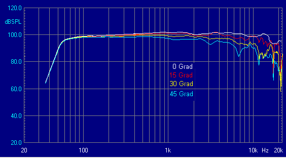 Bild unten: Unter 0, 15, 30, 45 Grad Winkel (horizontale Abweichung) von der Achse ist die niedere Übernahmefrequenz zu erkennen: Die 12 Zöller, die bis 1,45 kHz übertragen, strahlen bei dieser Frequenz noch mit einem großem Winkel ab.