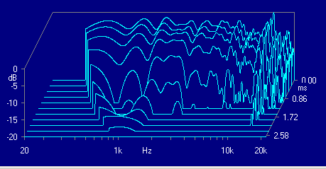 Wichtig für eine hervorragende Wiedergabe ist das zügige Ausschwingverhalten, was bedeutet, dass in nachfolgendem Diagramm nach vorn die Lautstärke zügig abfällt. Dies ist sehr gut erfüllt, wobei die Eigenchaften von Spitzen 1-Zoll Treibern nicht erreicht werden.