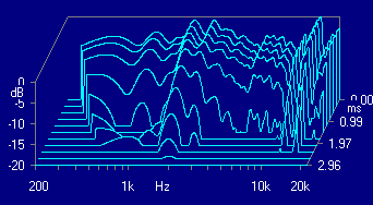 Wichtig für eine hervorragende Wiedergabe ist das zügige Ausschwingverhalten, was bedeutet, dass in nachfolgendem Diagramm nach vorn die Lautstärke zügig abfällt. Dies ist sehr gut erfüllt, wobei die Eigenchaften von Spitzen 1-Zoll Treibern nicht erreicht werden.