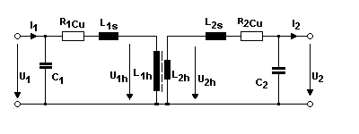 Dieses Ersatzbild ist ein physikalisches Modell für die Vorgänge in einem Übertrager. Man erkennt oben im Längszweig L1s, die Streuinduktivität der Primärseite und L 2s, diejenige der Sekundärseite, das sind Ersatzinduktivitäten für jene magnetischen Feldlinien, die nicht zur Kopplung der beiden Seiten beitragen; dann sieht man R1Cu und R2Cu, die beidseitigen ohmschen Wicklungswiderstände. In den Querzweigen sind C1 und C2 diejenigen Wicklungskapazitäten, die durch einander benachbarte Windungen mit Spannungsunterschieden zusammengefasst werden. Schließlich die Hauptsache eines Übertragers: Die transformierenden Teile der beiden Wicklungen; das sind auf der Seite 1 die primäre Hauptinduktivität L1h, auf der Seite 2 die sekundäre Hauptinduktivität L2h. Für sie gilt der Zusammenhang der Transformation: U1h:U2h = w1:w2. Dabei ist U1h kleiner als U1, da die Größen im Längszweig bei Stromfluss I1 die Spannung U1 reduzieren. Ebenso ist U2 kleiner als U2h wegen des Stromflusses I2. Bei kurzschlussnahem Betrieb verhalten sich die Ströme I1 : I2 = w2:w1, nicht jedoch bei Leerlauf, wo I2 = 0 ist!
