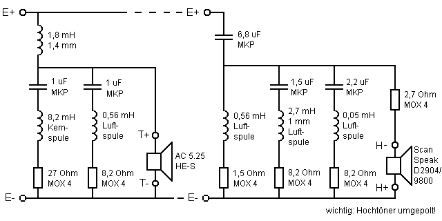 Man kann unter Berücksichtigung der Lautsprecher kaum eine weniger eingreifende Weiche erstellen: Diese Weiche erzielt auch eine absolut gleich laufende Phase des Hoch- und des Tieftöners über viele Oktaven um den Übergangsbereich.