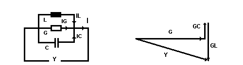 (9) Y = [ G2 + ( GL -GC)2 ]1/2 Dazu links das Schaltbild, rechts das Leitwertdiagramm: