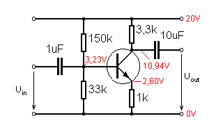 Wenn der Arbeitspunkt am Ausgang (also die Spannung am Kollektor) etwas oberhalb der halben Versorgungsspannung liegen soll, also beispielsweise um 11 V, dann fallen am Widerstand 20V - 11V = 9 V ab. Für einen Ruhestrom um 3 mA ist also ein Kollektorwiderstand von