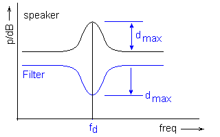 Please enter the loudspeaker impedance (4, 8 or ... Ohm) and the corresponding correction values (frequency fd, damping dmax) and adjust the width of the lowered curve with the buttons resp. .